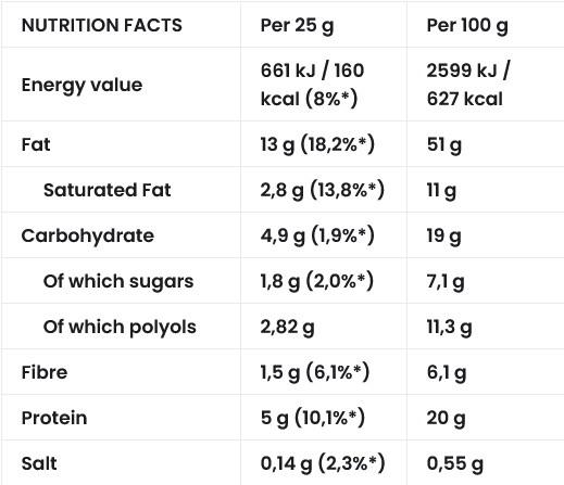 Състав:печени фъстъци (69%), обезмаслено мляко на прах, суроватка на прах (от мляко), подсладител: малтитол, слънчогледово масло, кокосова мазнина, емулгатор: слънчогледов лецитин, хималайска сол, аромат.