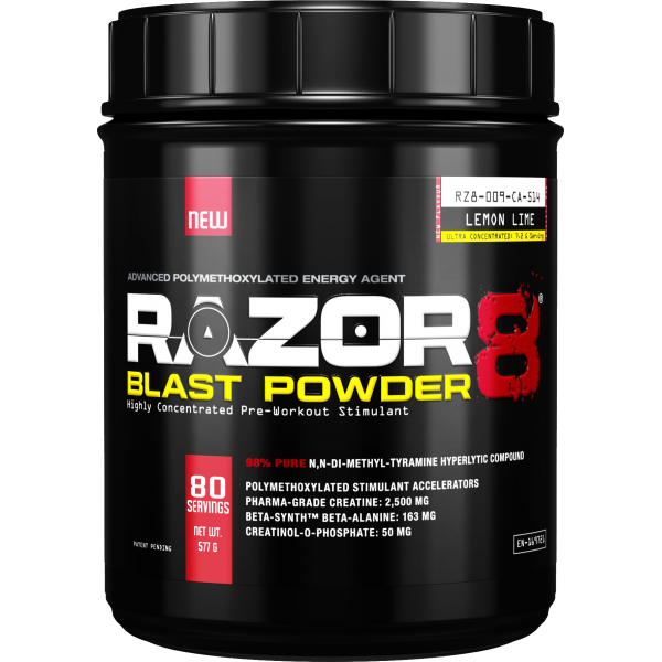Специално разработения предтренировъчен продукт RAZOR8 BLAST POWDER Ви доставя това, което искате с всяка доза: остър като бръснач фокус, екстремна енергия и безкрайна сила.