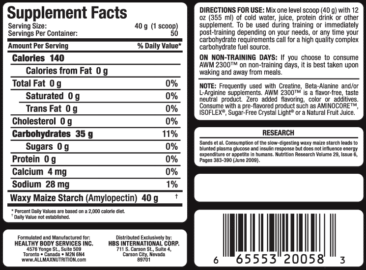 ALLMAX Waxy Maize 2300™ е превъзходен източник на въглехидратно гориво. Тази хранителна добавка е с изключително нисък процент на осмоларитет, което означава, че тя се абсорбира и усвоява много добре С нула грама захар и без глутен, Waxy Maize 2300™ не предизвиква подуване на корема и задържане на вода. С молекулно тегло над 3000 пъти по-голямо от това на декстрозата, AWM2300 ™ има способността да изтегля другите хранителни вещества, като креатина, бета-аланина и аргинина, през чревната стена и увеличава тяхното усвояване.
