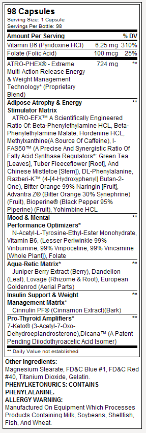 ATRO-EFX™: Тази формула е разработена с помощта на последния пробив в науката за екстрактирането и съдържа точно изчислена пропорция от естествени вещества включващи Carum Carvi,Swertia chirata(източник на Магниферин) и Razberi-K™ (малинови кетони). ATRO-EFX™ има бърз и позитивен ефект върху енергията, подтискането на апетита, настроението и ранотоспособноста. Този ефект е бил и първо забелязан от участниците в изследванията на BSN за ефективността на Atro-Phex