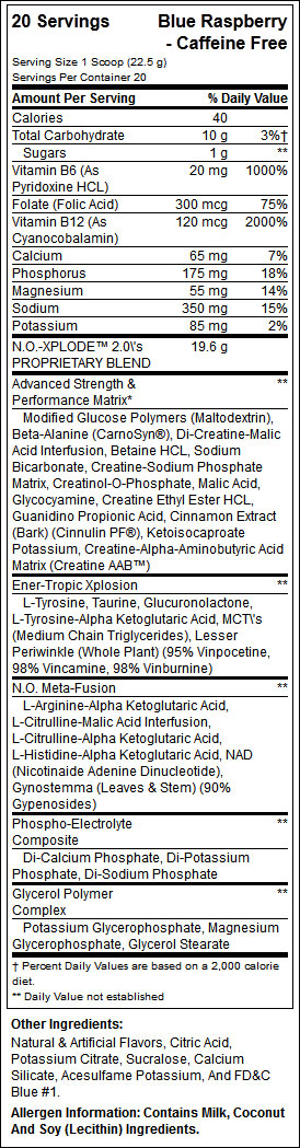 N.O.–Xplode™ 2.0 Caffeine Free е новата революция сред азотно-напомпващите продукти. Белязана с името на своя доказан предшественик, новата формула на BSN е създадена за да отбележи нови стандарти и успехи в своя клас. N.O.–Xplode™ 2.0 Caffeine Free е по-силният, по-ефективният, по-добрият предтренировъчен продукт, за който всички сме мечтали. Поставете си нови фитнес цели, защото сега ще разполагате с новаторско и безотказно средство за постигането им.