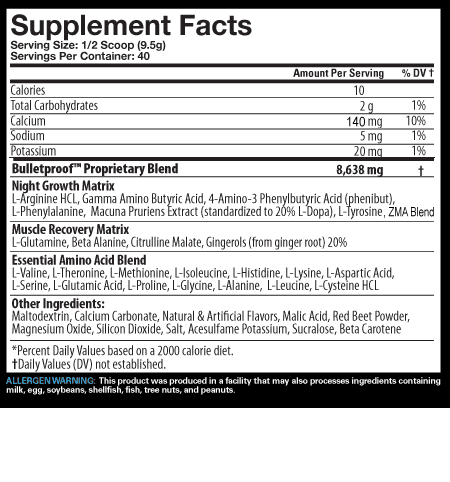 Bullet Proof е съчетание от добре комбиниране съставки, всяка от които изпълнява важна роля за среднощното възстановяване. Ключовите съставки в Bullet Proof са: