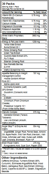 Shred Matrix™ комбинира в себе си единствено и само най – нужните съставки за да ви даде всичко необходимо да получите образа, който желаете от години! Технология, която по два начина чрез няколко матрици атакува подкожните мазнини от всеки един ъгъл по най – бързия и ефективен начин, резултата е ФИЗИКАТА, която винаги сте желали!