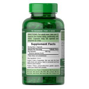 Puritans Pride Saw Palmetto 450 mg е хранителен суплемент, съдържащ натурален екстракт от Сао Палмето. Формулата е специално насочена към поддържане на мъжкото здраве. Подходящ избор при нужда от повече енергия, подобряване на настроението и либидото, повече сила и издръжливост.