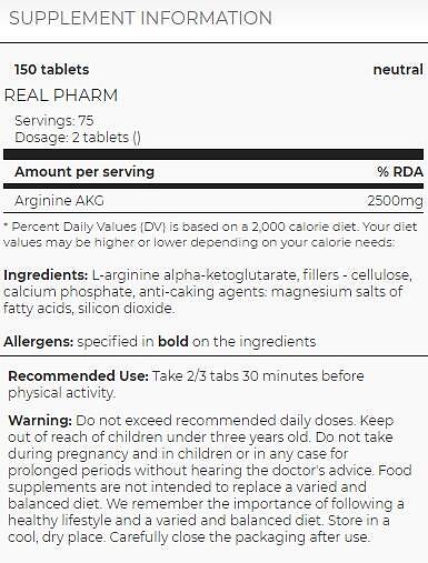 AAKG Real Pharm е хранителна добавка съставена от най-висококачествени суровини и предоставена ви под формата на таблетки, които са лесни за преглъщане и с максимално висока концентрация на активната съставка от 1250мг на всяка таблетка.