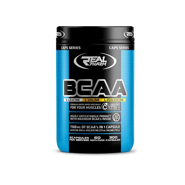 BCAA 1100mg Real Pharm 300 капсули – хранителна добавка с аминокиселини с разклонена верига /BCAA/, които са изключително важни за спортуващите и желаещи да подобрят физическото си представяне, покачването на мускулна маса и търсещи опция за по-ефективно възстановяване.