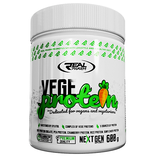Vege Protein Real Pharm е растителен протеин съдържащ 5 различни източника на протеини: соев протеин изолат, грахов протеин, протеин от червена боровинка, оризов протеин, слънчогледов протеин.
