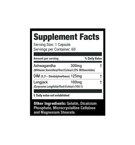DIM (3, 3’-Diindolylmethane) – иновативна съставка,която нямалява страничните действия на естрогена в тялото.В използваните количества DIM в продукта,естрогенът може да бъде намален с близо 45%!Това го прави идеален синергист с останалите две съставки Ashwagandha и Longjack за максимално натурално производство на тестостерон.