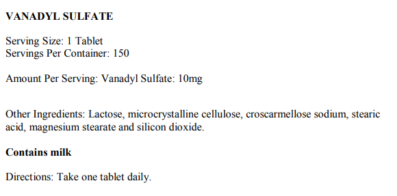 Ванадил сулфат е форма на минерала Валадиум, която има инсулиноподобно действие в организма и увеличава концентрацията на глюкоза, протеини и аминокиселини в мускулите. Това е необходимо за нормалното развитие и функциониране на клетките в тялото.